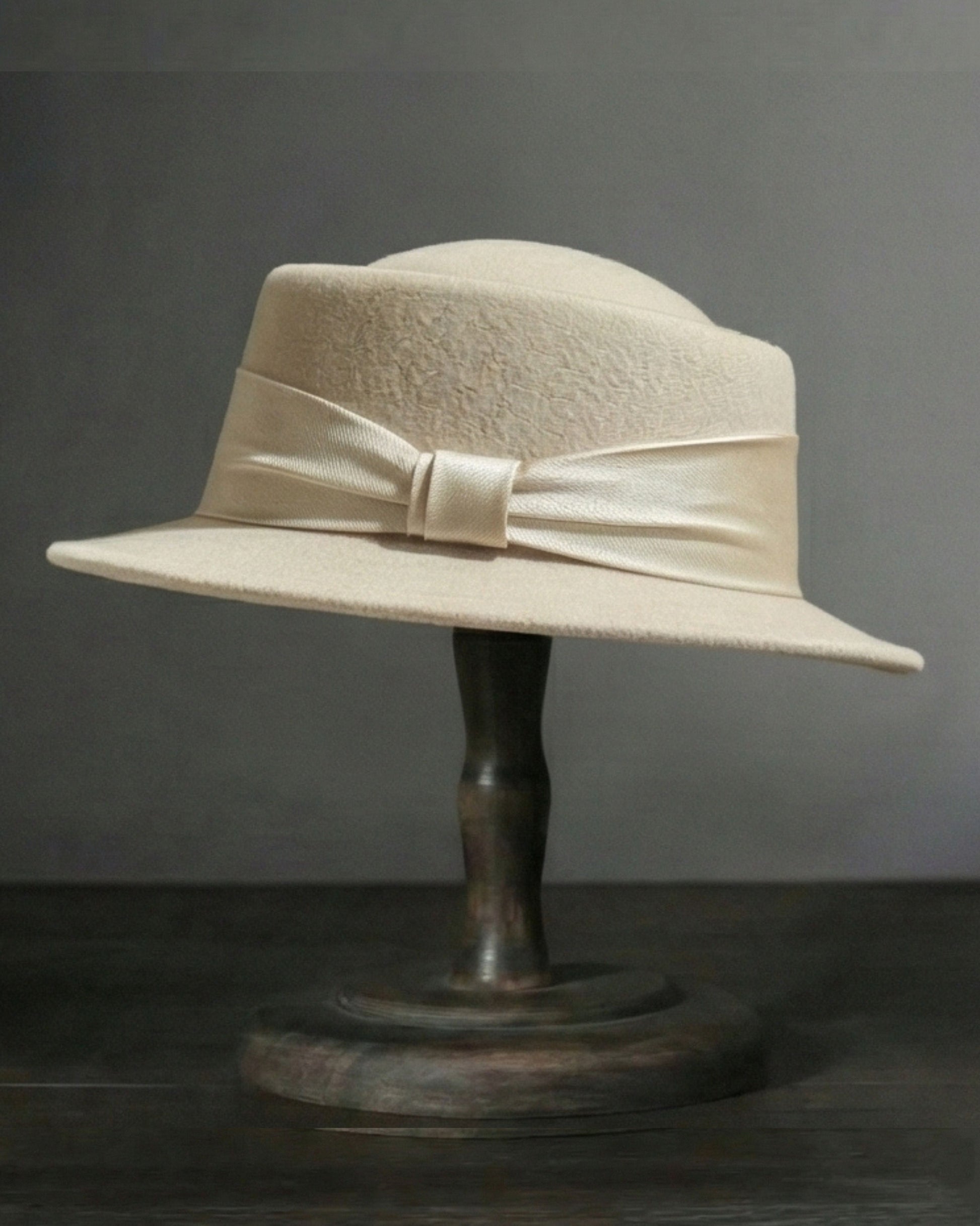 Description: Elevate your seasonal wardrobe with the Eleanor. Expertly crafted from premium soft-touch wool felt, this hat features a classic telescope crown and a structured brim that offers a timeless silhouette. The look is finished with a lustrous, tonal satin ribbon that adds a touch of understated luxury to the matte texture of the felt.